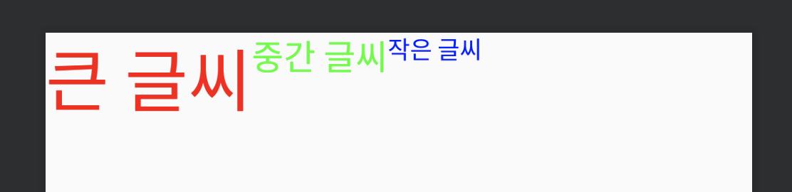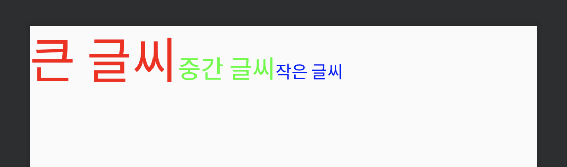 1 2 3 4 5 6 7 8 9 10 11 12 13 14 15 16 17 18 19 20 21 22 23 24 25 26 27 28 29 30 31 32 | <?xml version="1.0" encoding="utf-8"?> <LinearLayout xmlns:android="http://schemas.android.com/apk/res/android" android:orientation="horizontal" android:layout_width="match_parent" android:layout_height="match_parent"> <TextView android:layout_width="wrap_content" android:layout_height="wrap_content" android:text="큰 글씨" android:textColor="#ffff0000" android:textSize="40sp" /> <TextView android:layout_width="wrap_content" android:layout_height="wrap_content" android:text="중간 글씨" android:textColor="#ff00ff00" android:textSize="20sp" /> <TextView android:layout_width="wrap_content" android:layout_height="wrap_content" android:text="작은 글씨" android:textColor="#ff0000ff" android:textSize="14sp" /> </LinearLayout> | cs |